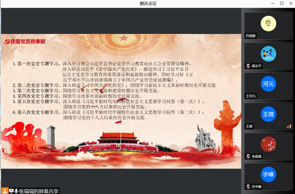 首先,支部副书记张瑞瑞同志向大家介绍本次会议的基本流程和主要内容。紧接着,张瑞瑞同志带领大家回顾了之前六次的党史专题学习,对每次学习的内容和中心思想做出了总结和提升,并且要求党员们继续加强党史学习。接着,大家一同学习了习近平总书记在建党一百周年大会上的讲话精神。张瑞瑞同志强调,大家要像习近平总书记说的那样,增强“四个意识”、坚定“四个自信”、做到“两个维护”、继续为共产主义努力奋斗。然后,各位同志依次发言,表达了对本次学习的心得和感想。