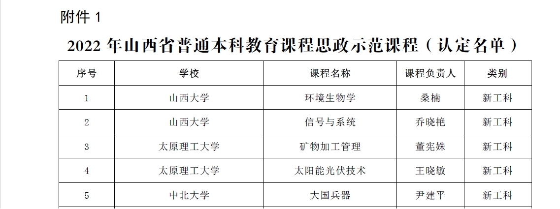 根据《山西省教育厅关于开展普通本科教育课程思政示范课程建设工作的通知》(晋教高函[2022]9号),经学校推荐、教育厅评审,全省评出“新工科”、“新农科”、“新医科”、“新文科”课程思政示范课程共100门,其中认定课程41门、培育建设课程59门。