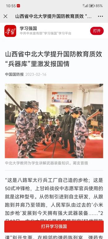 入选“大思政课”实践教学基地后,学校依托“兵器装备陈列室”,精心制作的《大国兵器》等国防教育特色课程上线学习强国、军职在线、国家智慧高教等平台,实现了国防教育课程的系列化、集群化、网络化,增强了课程的亲和力、吸引力、感染力,育人效果彰显。