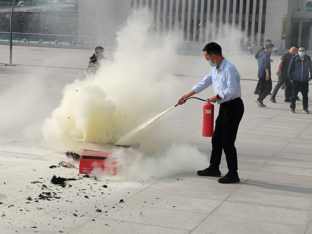 演练开始后,楼内师生有序撤出到科学楼西侧平台;然后史科长对消防安全知识进行了细致讲解,特别强调电动车不能在楼里充电,因为电动车一旦燃烧起来,毒烟会迅速向上蔓延,很快就能导致整幢楼陷入毒烟密布的状态,造成人员伤亡甚至群死群伤的火灾事故;接着史科长为师生们讲解了灭火器的正确使用方法和注意事项,并对灭火器的使用进行示范,随后大家亲自体验了现场灭火。整个消防灭火演练过程井然有序,有条不紊。