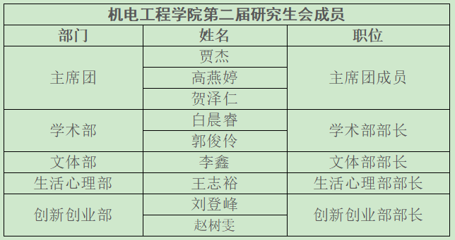 第二届研究生会主席团成员以及各部门部长人选如下: