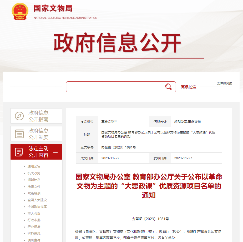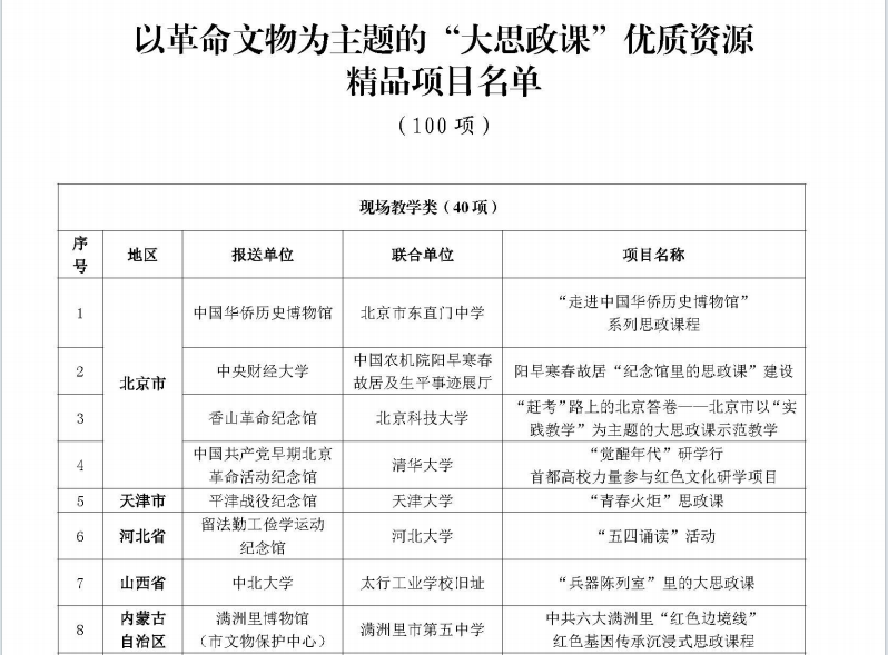国家文物局办公室、教育部办公厅表示,要以示范项目和精品项目为引导,进一步聚焦主题,依据不同受众着力开发一批契合教学目标的思政课程,着力打造一批“纪念馆里的思政课”、“行走的思政课”品牌,切实推动不同学段学生走进场馆开展学习实践,充分发挥革命文物铸魂育人作用。
