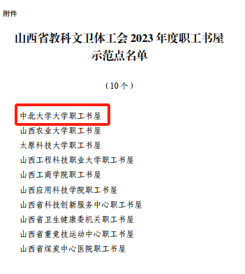 2023年12月13日,山西省总工会下发《山西省教科文卫体工会关于命名2023年度职工书屋示范点的通报》,我校职工书屋获评“山西省教科文卫体工会 2023 年度职工书屋示范点”。