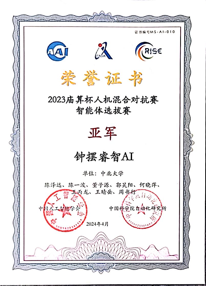曹红松、王丙龙老师指导的由本科生和硕士研究生联合组建的创新团队—“钟摆睿智AI”经过21天3轮排位赛的激烈角逐,荣获亚军。