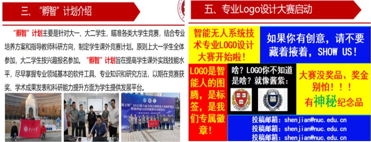 在会上,沈剑老师宣布专业的“孵智”计划和Logo设计大赛并介绍实施细则。“孵智”计划贯穿大学四年,结合学生不同阶段专业能力素养,为学生设计阶梯式成长路线,将专业学习与科创竞赛紧密相融,积极探索建立以创新创业为导向的新型人才培养模式,旨在充分挖掘学生科研潜能,培养具有“军工情怀、专业素养、创新精神、德才兼备”的优秀人才。“专业Logo设计大赛”有助于树立专业形象,培养学生专业认同感,提升专业凝聚力。