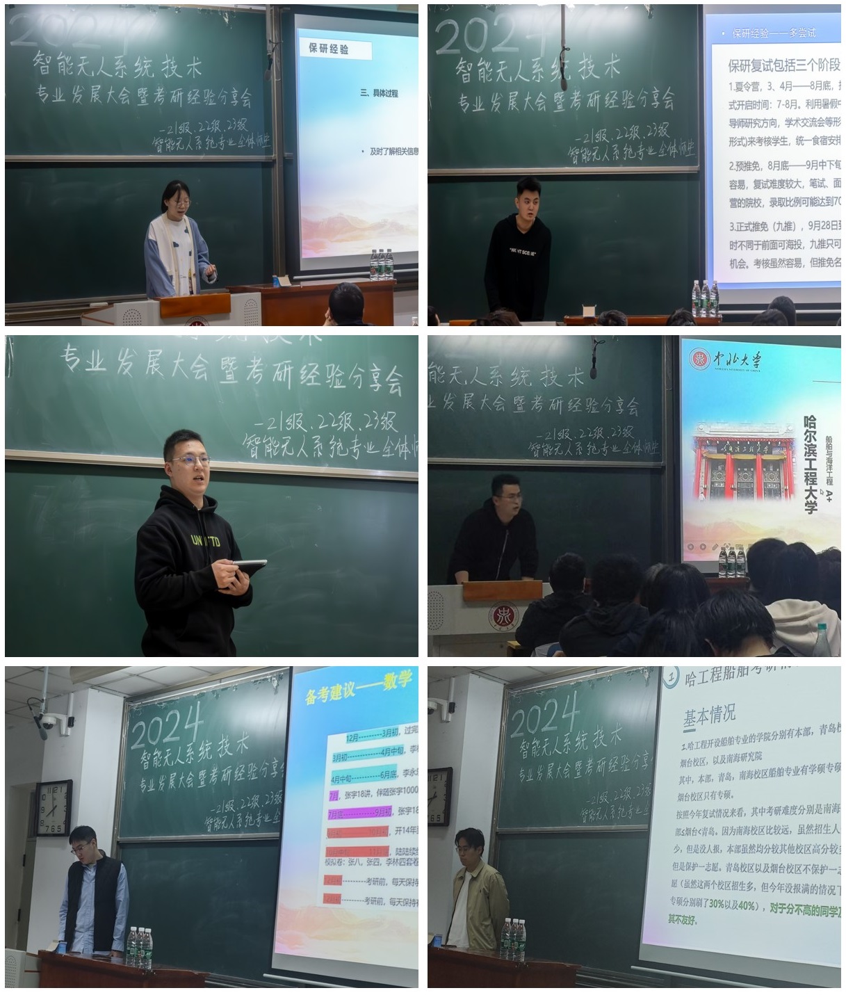 随后,6名来自2020级智能无人系统技术专业的优秀学生根据自身经历,向低年级同学们传授了宝贵的保研、考研经验分享。保研至西安交通大学的左振鑫同学进行了保研全流程解读;即将在本校攻读工程博士学位的黄蓓同学介绍了“工程硕博”专项计划详细情况;成功考研“上岸”至北京理工大学、西北工业大学、哈尔滨工程大学的陈国庆、沈敬学、李延昊和陈鼎四位同学依次讲述了择校、备考经验。分享会覆盖范围全面,有助于低年级同学们结合自身情况做好继续深造的规划。