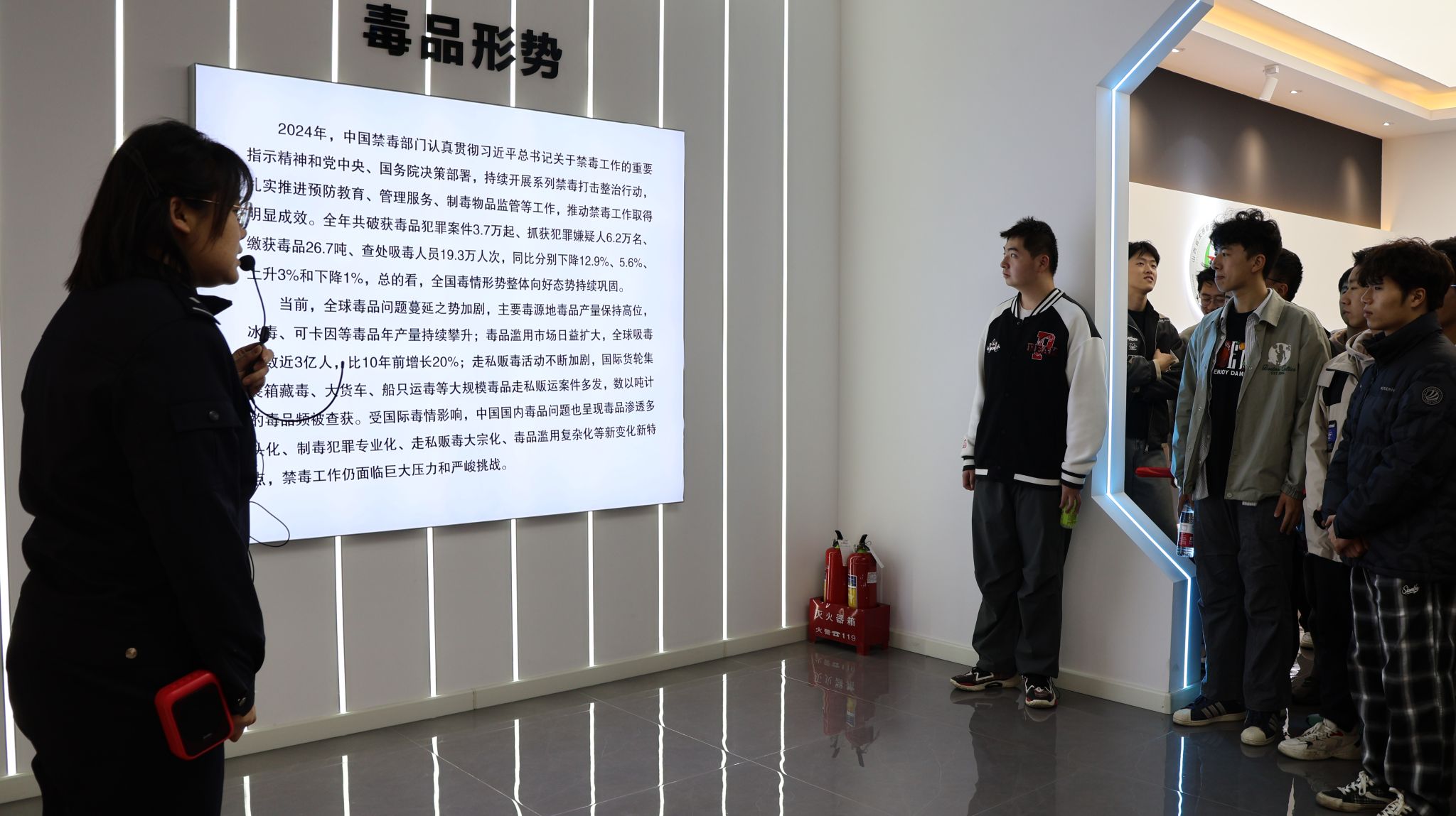 戒毒所教育科科长杨莉、心理矫治中心主任白丽萍、康复训练中心主任张建刚全程陪同。师生首站走进禁毒知识展厅,触目惊心的图片、发人深省的文字与真实案例,系统展现毒品危害。同学们认真聆听讲解,眼神满是震惊与警醒,深刻认识到 “一日沾染,终身难戒” 的后果。