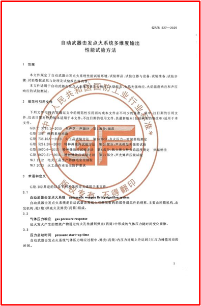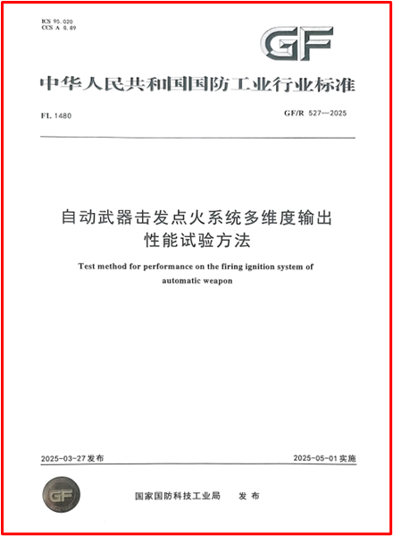 《自动武器击发点火系统多维度输出性能试验方法》是我国国防工业行业标准首批发布的标准,该标准的制定与发布,不仅系统建立了自动武器击发点火性能的多维度试验体系,也为相关装备的产品研发、质量评估与可靠性验证提供了科学依据。