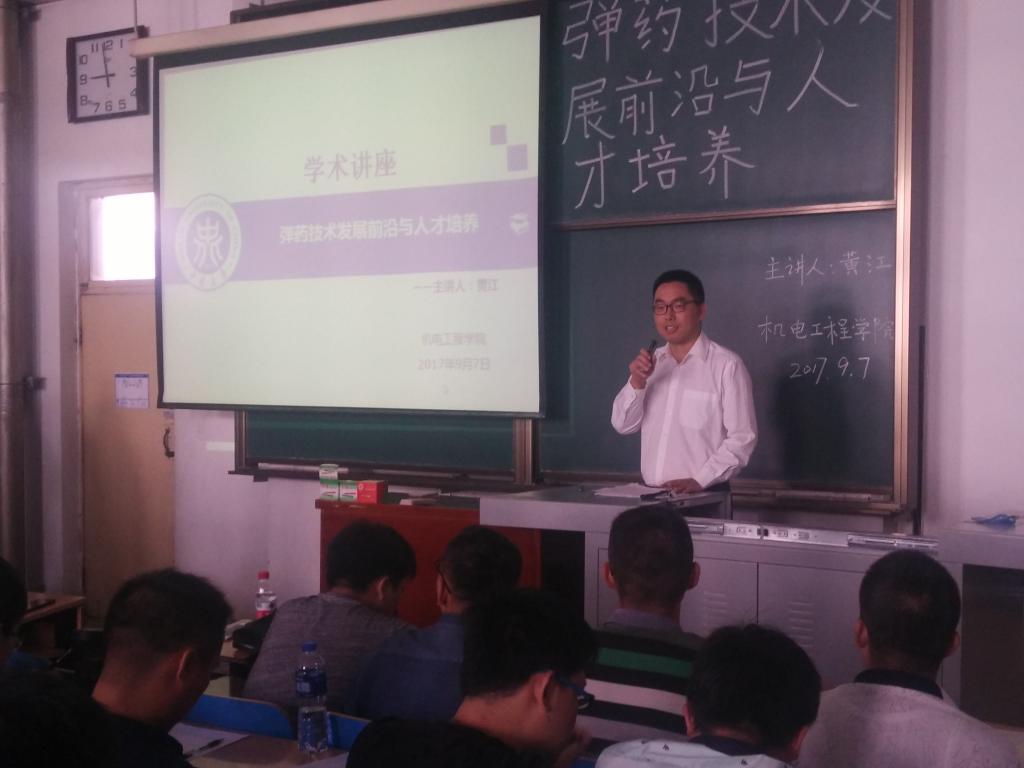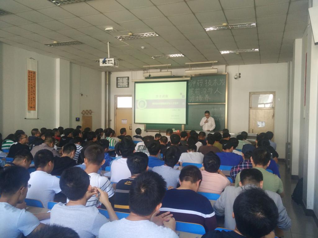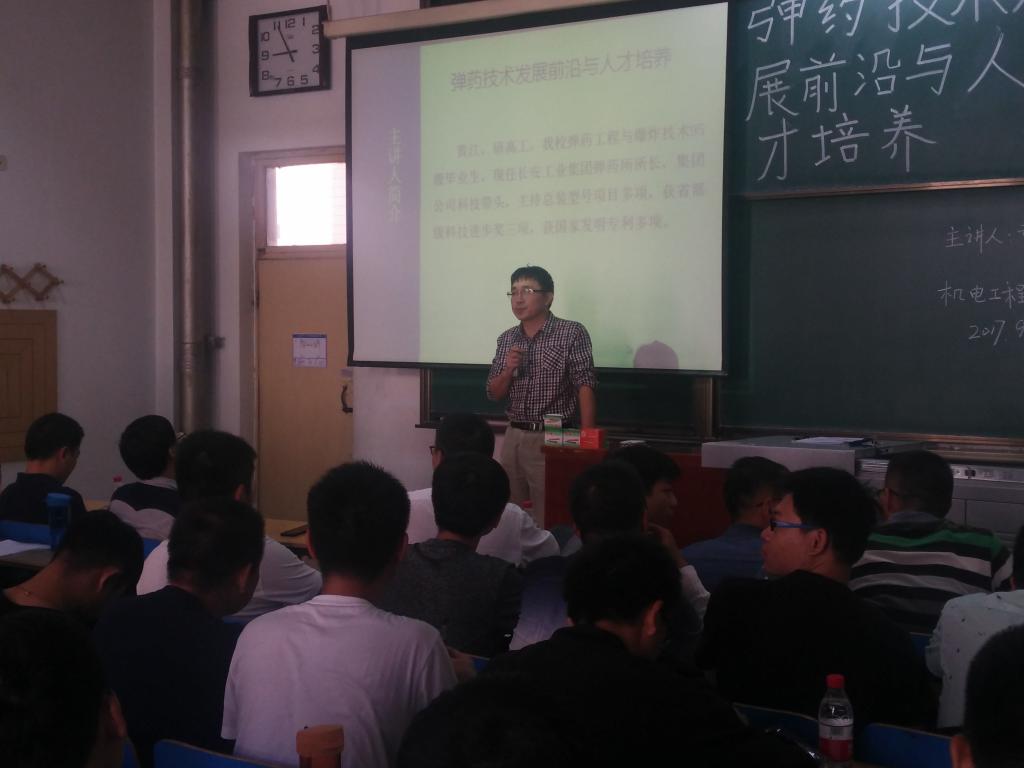 副院长李世中教授首先对黄江研究员做了详细介绍,然后黄所长播放长安工业集团的宣传视频,视频充分展现了长安工业集团百余年的军工历史与艰苦奋斗的光荣传统;黄所长又对国内外弹药技术发展趋势、小口径弹药发展动态、中大口径弹药发展动态、引信发展动态几个方面进行了深入浅出的讲解,让同学们对弹药发展的前沿有了清楚的认识与深刻体会。黄所长最后对人才培养提出自己意见,黄所长以自身为例从热爱、学习、政治三个方面发表了看法。黄所长认为我们必须热爱一个行业,才能干好这个行业;热爱同时我们必须要学习,只有学习才能使我们进步;而每一个兵工人都应该时刻关注政治,为国家做出应有的贡献。