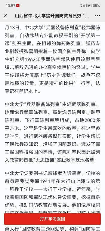 党委副书记雷锋斌告诉笔者,学校的前身是我党我军1941年在太行山上建立的第一所兵工学校——太行工业学校。近年来,学校着眼国防和军队现代化建设需要,挖掘自身优势,推动国防教育创新发展。他们浓厚校园国防文化氛围,建起军工文化园、国防人物雕塑群、国防文化长廊、兵器装备陈列室、“红色太行”国防教育主题网站等,构建“国防军工文化课+国防理论通识课+国防军事训练课+国防创新实践课+国防特色专业课”五位一体、28门课程组成的国防特色课程群,不断培固学生投身军工、献身国防的思想根基。