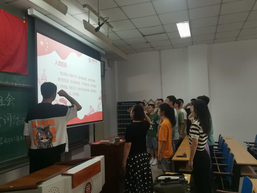 首先,支部书记李晶晶老师对入党的过程做了简单的介绍,并且强调做为一个党员要有很高的责任感和政治敏感度。老师对大家的日常行为做出了要求,希望预备党员和党员都要严格要求自己,要和入党誓词中说的一致,积极参与工作,服务人民。接下来,支部副书记张瑞瑞同志带领此次接收的预备党员同志进行宣誓,并且由支部书记李晶晶老师为各位同学佩戴党徽。紧接着,张瑞瑞同志带领预备党员和党员进行了重温入党誓词的宣誓。结束宣誓之后,所有人一起唱了《国际歌》。