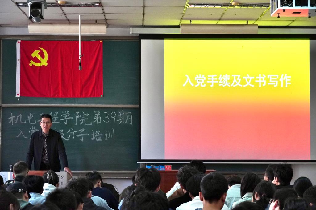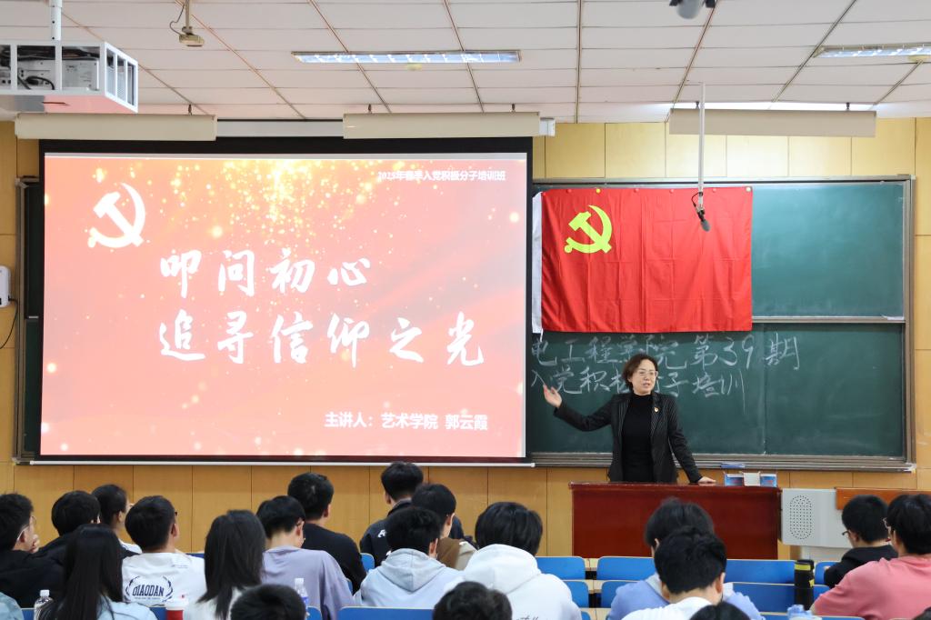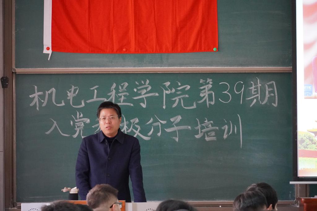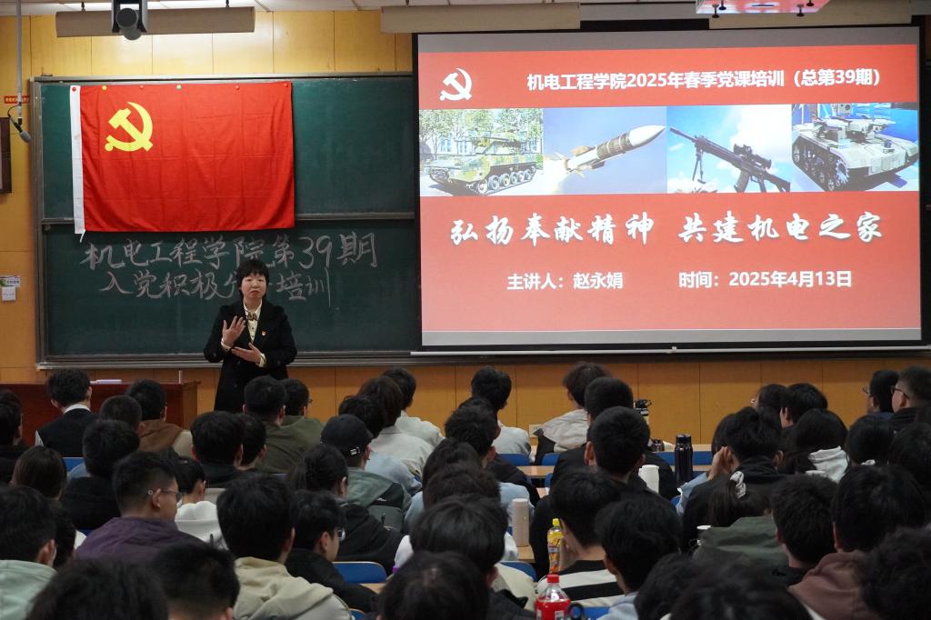 党委书记赵永娟讲述《弘扬奉献精神,共建机电之家》,她首先带领积极分子了解学校及学院的基本情况,要求各位同学牢记强军使命。二是要求同学熟知学院“三全育人”的工作思路,提升奉献意识。三是明白奉献精神的实质内涵,要求同学们弘扬奉献精神。四是要发扬入党积极分子的作用,共建机电之家。在提升自己的同时,也为班级建设、学院发展做出自己的贡献。