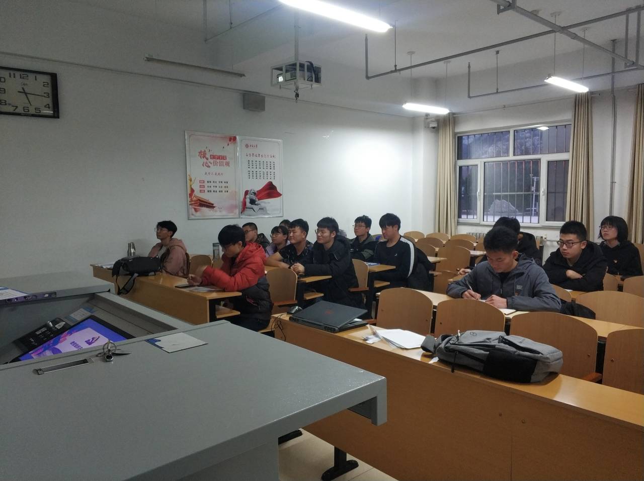 会议第二项内容,各位发展对象轮流上台发言答辩。发展对象主要从个人简介、学习情况、工作情况、志愿服务情况与入党动机等几方面进行答辩,并在发言后对培养联系人的提问进行回答。答辩结束后,支部内全体预备党员与正式党员对各位发展对象进行记名评分,并对每位发展对象的党材书写情况进行互评,最后由支部支委进行统计汇总。